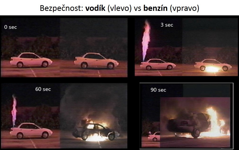 Z obrázku 2 je jasně patrné, že zapálený vodík prudce uniká nad automobil a pouze vyhoří bez přímého ohrožení posádky a zbytku karoserie vozu. Oproti tomu benzín je kapalina, která může vytéct pod vůz a následně dojde ke vzplanutí celého vozidla, které na obrázku shoří až na „kostru“ vozu. Na následujících odkazech najdete další video k tématice bezpečnosti vodíku:
