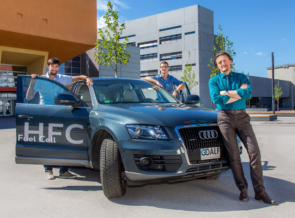 Professur Thomas von Unwerth von der Technischen Universität Chemnitz mit den wissenschaftlichen Mitarbeitern Martin Uhlmann und Christian Schmidt vor einem Brennstoffzellenfahrzeug
