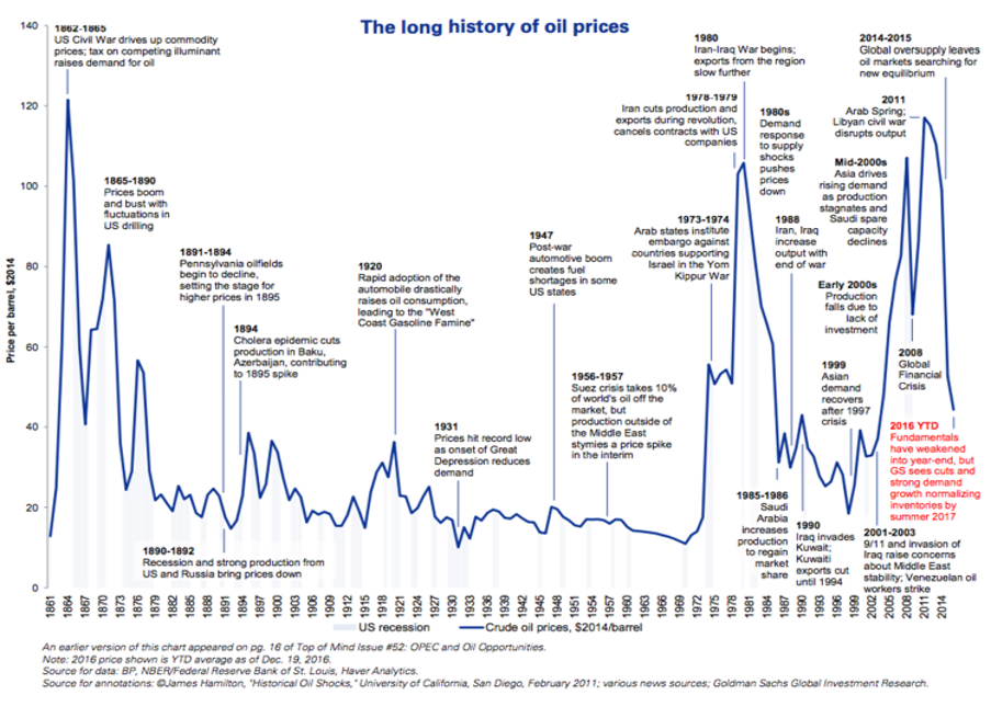 Zatím se vždy jedná o vzájemné působení nabídky a poptávky, na jejichž pozadí můžeme sledovat nejrůznější přírodní katastrofy, války, ekonomické jevy nebo geopolitiku. Například v roce 2008 se mnoho investorů snažilo zabránit ztrátám vznikajícím na hypotečním trhu a začali proto masivně nakupovat na trhu s energetickými a potravinářskými komoditami. Zvýšená poptávka potom vedla k růstu cen nejen ropy, ale i plynu nebo zemědělských plodin. Uceleně ukazuje vývoj cen ropy od počátku těžby následující obrázek.
