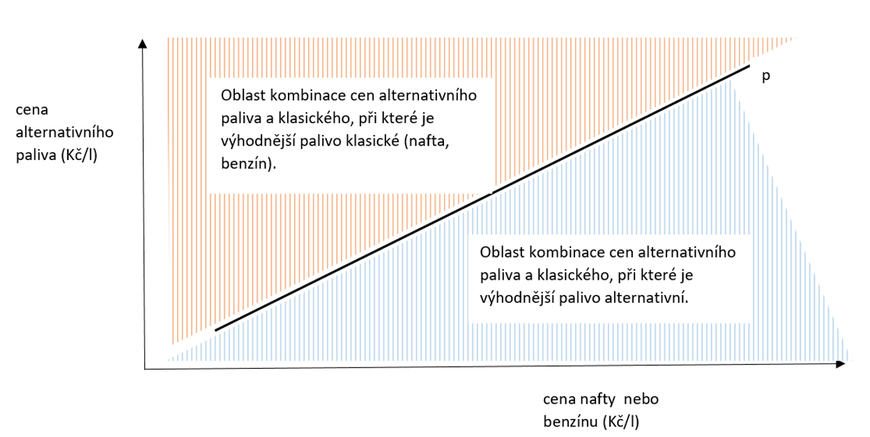 Různé kombinace cen alternativního paliva a nafty, pro něž bude platit, že celkové náklady při použití alternativního paliva jsou rovny nákladům při použití benzínu nebo nafty jsou vyneseny prostřednictvím přímky p na obrázku 4. Pokud skutečná kombinace cen nafty (benzínu) a alternativního paliva bude pod přímkou p, tedy v modrém poli, potom bude z hlediska nákladů výhodnější použít alternativní palivo. Naopak, pokud bude skutečná kombinace cen nad přímkou p, tedy v červeném poli, bude výhodnější z nákladového hlediska nafta (benzín).