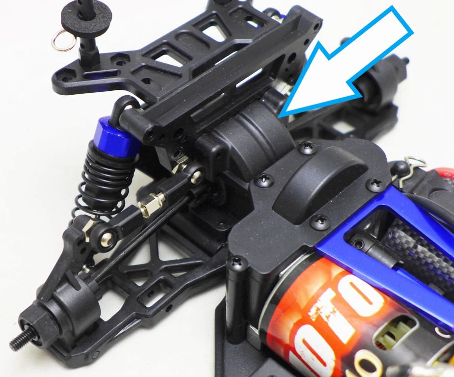Umístění diferenciálu zadní nápravy na našem modelu ukazuje šipka. Stejný diferenciál najdete i na přední nápravě.